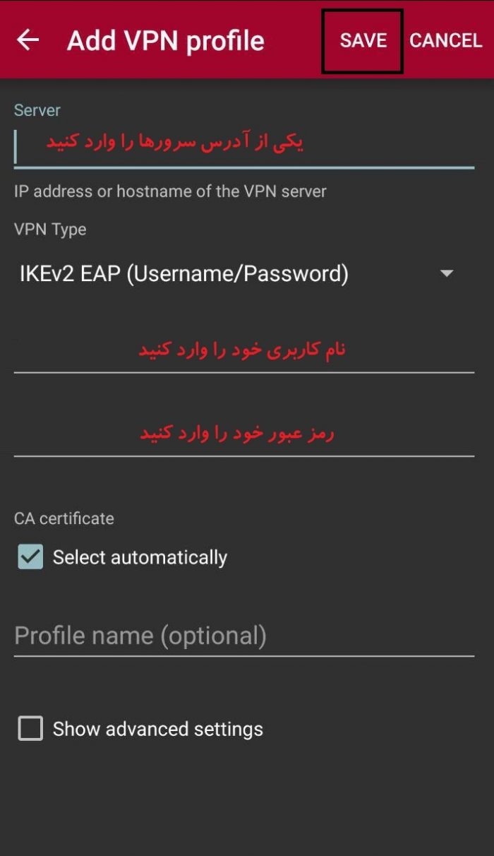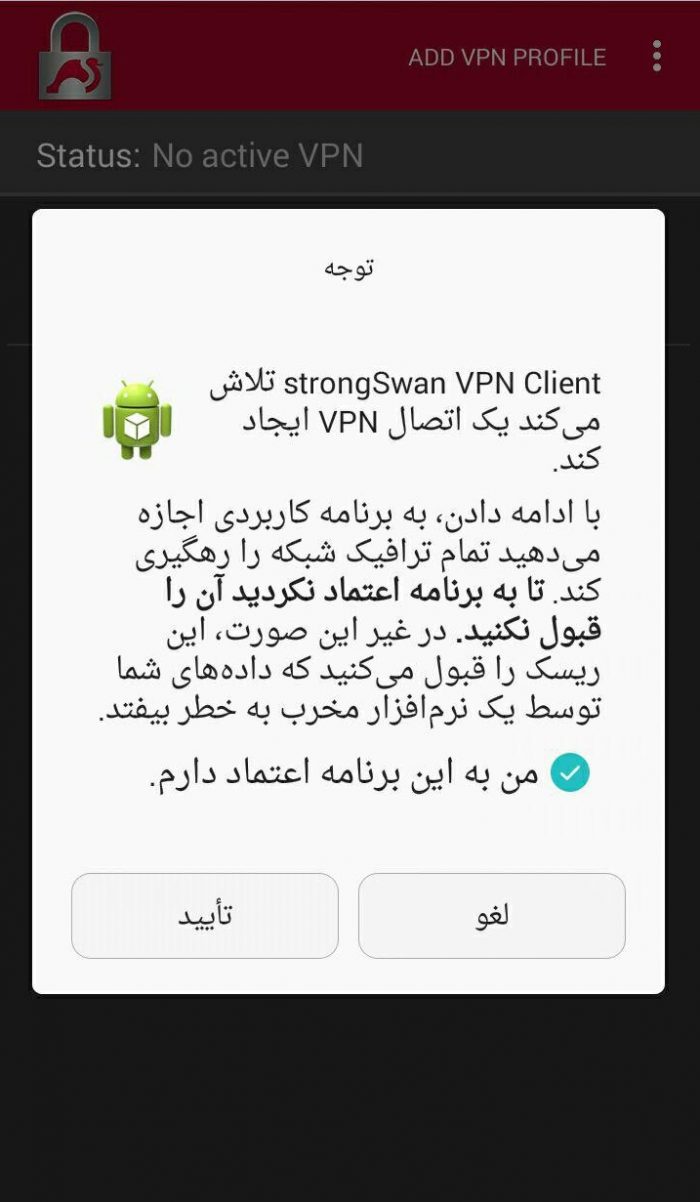 2 – پس از اجرای برنامه StrongSwan طبق عکس های زیر انجام بدید